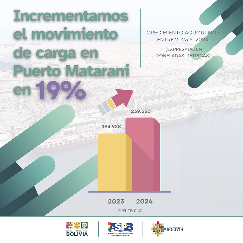 Entre 2023 y 2024, el volumen de movimiento de carga en el puerto de Matarani (Perú) se incrementó en 19%, al pasar de 193.928 toneladas métricas (TM) a 239.550 TM, de acuerdo con el reporte del Sistema de Administración de Puertos (SIAP) que maneja la Administración de Servicios Portuarios Bolivia (ASP-B).