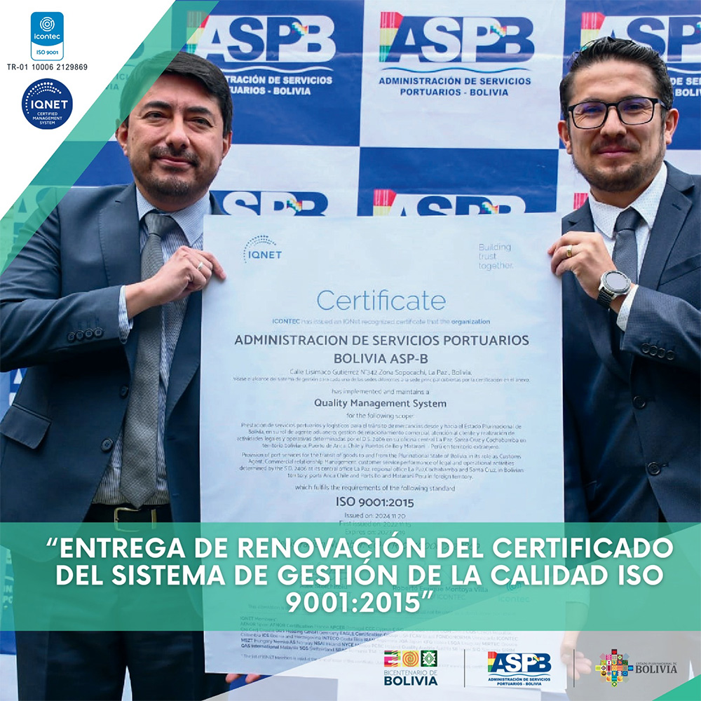 Luego de la auditoría realizada, ICONTEC entregó la renovación de Certificación a la ASP-B por la prestación de servicios portuarios y logísticos para el tránsito de mercancías desde y hacia el Estado Plurinacional de Bolivia, en su rol de agente aduanero; gestión de relacionamiento comercial, atención al cliente y otras atribuciones establecidas mediante D.S. N° 2406, que las desarrolla en sus distintas oficinas en territorio nacional (La Paz, Santa Cruz, Cochabamba, Oruro y Sucre); así como en territorio extranjero (Puertos de Arica y Antofagasta en Chile y Puertos de Ilo y Matarani en Perú).